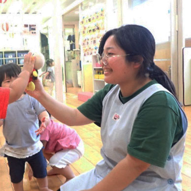 現在1,2歳児のクラスを担当しています。去年0歳児クラスに入り、お子様との関わり方に悩んでいましたが、優しい先輩方の指導の下、楽しく学ばせていただきました。入職して0歳児クラスから見守ってきたお子様が、お話が上手になり「先生」と呼んでくれた時はとても嬉しかったです。そんな小さな嬉しいと思う日々が味わえるのは、保育士ならではだと思っています!